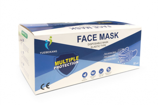 Máscara de proteção descartável de 3 camadas, com elásticos de orelha.